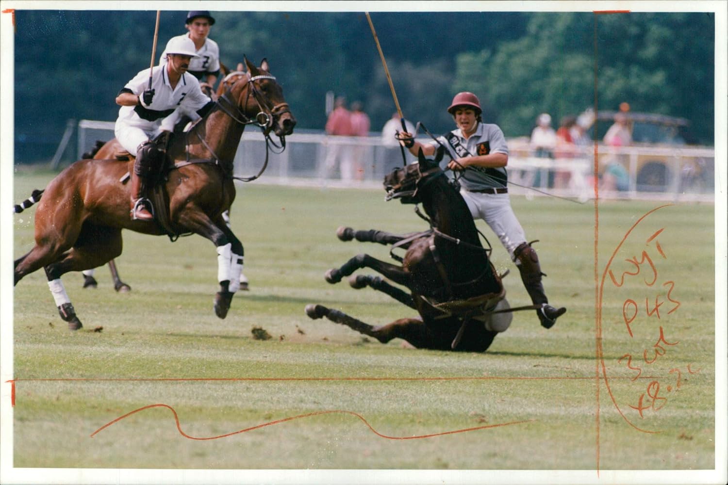 La foto es del momento exacto en que Sebastian Merlos, jugando la temporada inglesa se cae de se yegua en una jugada donde fue a buscar la bocha contra Gonzalo Pieres, quien defendia los colores de Ellerston.